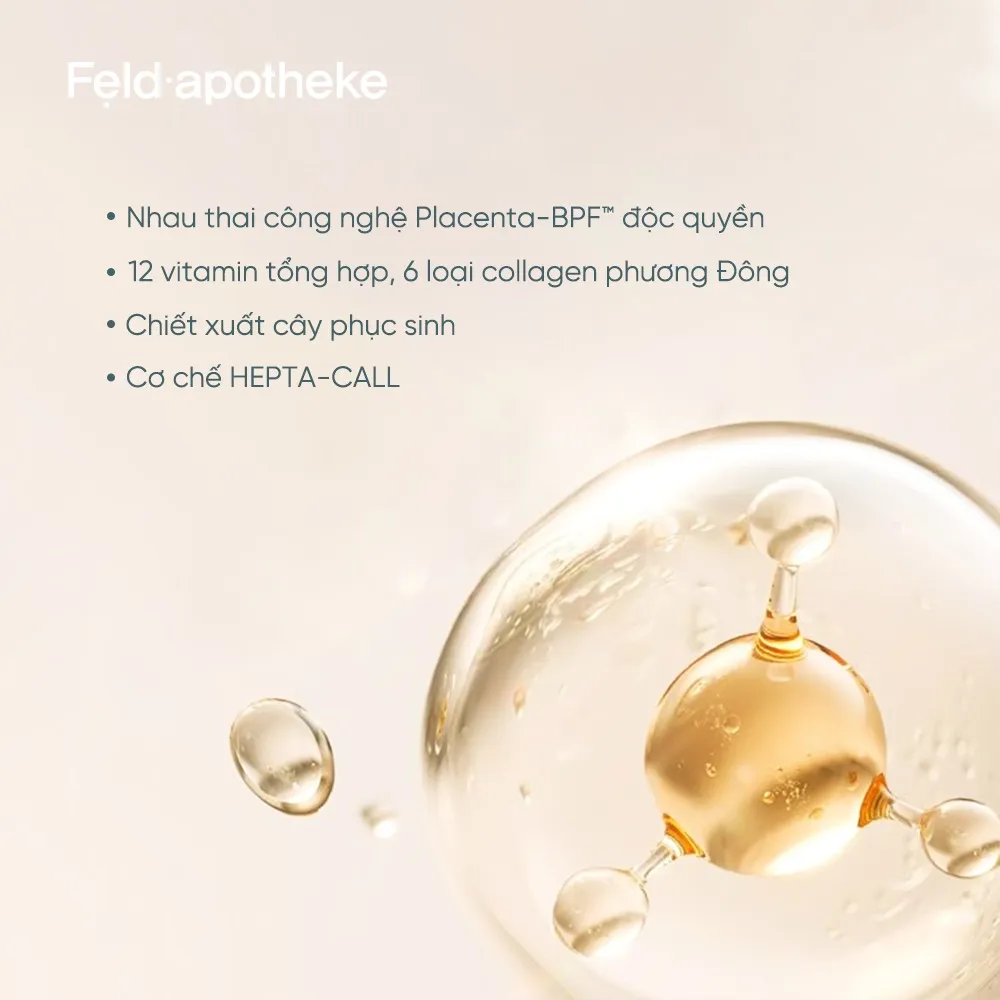 Nhau thai BPF™ (nhau thai sinh học - Noãn thực vật kết hợp với các yếu tố tăng trưởng tế bào) HEPTA COL™ (12 loại vitamin tổng hợp, 6 loại collagen) SUPER - HA7™ (6 gốc HA kết hợp yếu tố cấp ẩm tự nhiên NMF)